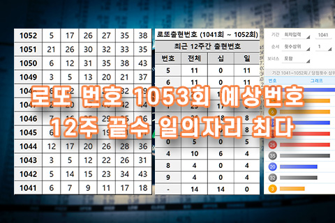 로또 번호 1053회 예상번호 12주 끝수 일의자리 최다 1053회 고정수 가능, 로또 1052회 포함 12주간 1등 당첨번호 리스트