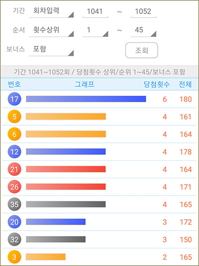 보너스 포함하여 1041회 ~ 1052회 12주간 당첨횟수를 검색했습니다.