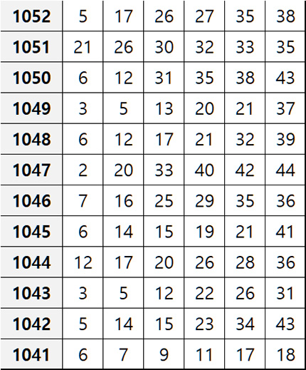 1052회차까지 추첨된 번호에서 1등 번호가 정리한 표입니다. 보너스는 제외했습니다.