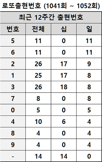 지난 로또 1052회 당첨번호 조합까지 포함하여 12주간 출현 숫자들을 끝수 일의자리 기준으로 집계한 자료도 공개합니다.