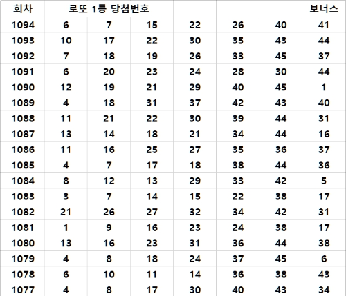로또 1095회 당첨 예상번호를 분석하기 위해서 최근 로또 1등 당첨번호와 보너스 번호 내역을 정리한 표입니다.