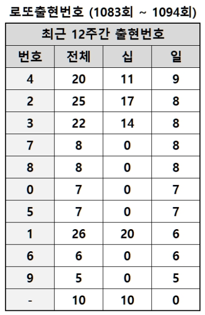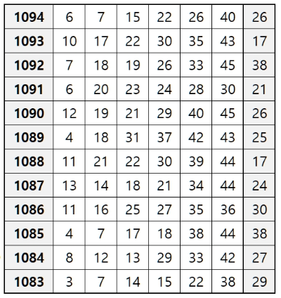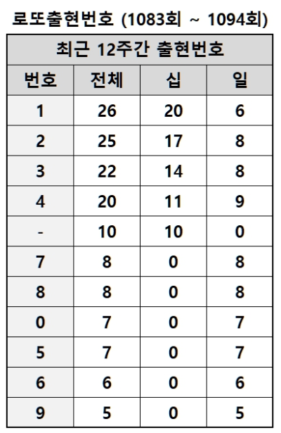 1083회차에서 1094회차까지 12주 동안 1등 당첨번호에 나왔던 숫자를 분석합니다.