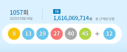 로또 1057회 당첨번호는 고른 색상 분포를 보였고, 역대 로또당첨번호 최다 당첨번호에서 1등 번호 13번 27번, 보너스 12번이 일치되었습니다.