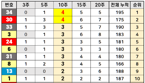 시야를 좀 더 넓혀서 최근 10주 동안의 패턴도 살펴볼게요.  30번과 34번이 4번씩 당첨되었고요.