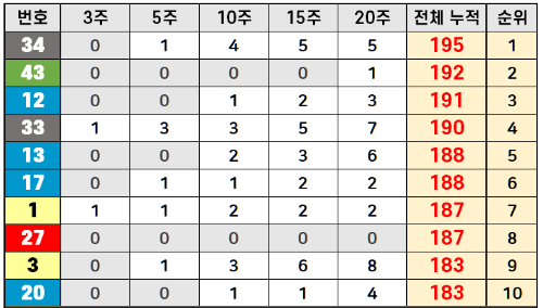 반면에 10, 42, 23, 43, 27, 39, 29, 18번은 10주 동안 한 번도 등장하지 않았어요. 이 중에서 어떤 번호가 이번 주에 깜짝 등장할지 모르니 유심히 봐둘 필요가 있겠죠?
