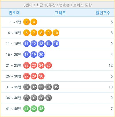 역시 1번대, 10번대 번호들이 보이는데, 최근 당첨번호 중심으로 로또 1065회 당첨번호를 구성한다면, 5주 데이터를 이용해야 합니다.